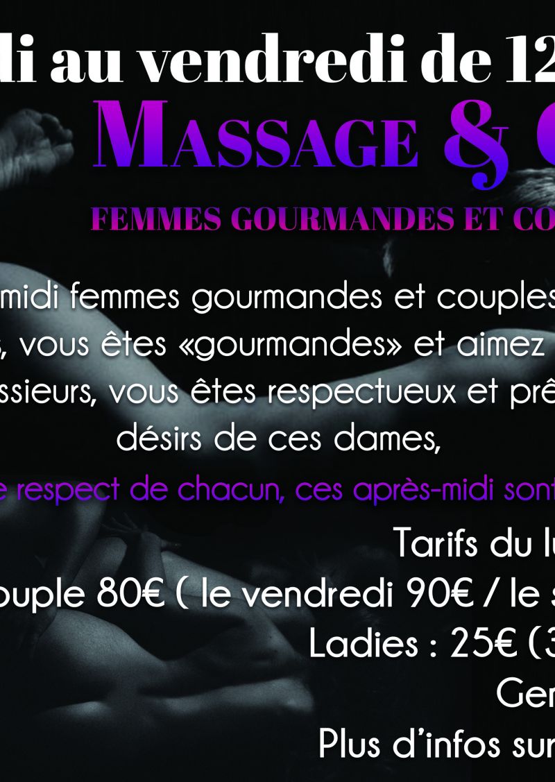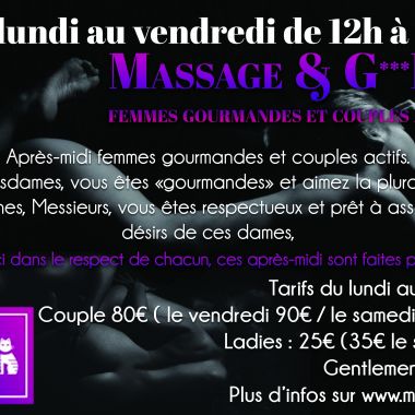 Les mercredis, entre 19h et 23h, une masseuse sera disponible pour tous les couples désirant passer dans ses mains expertes. Et toujours massages érotiques pour les Messieurs seuls!