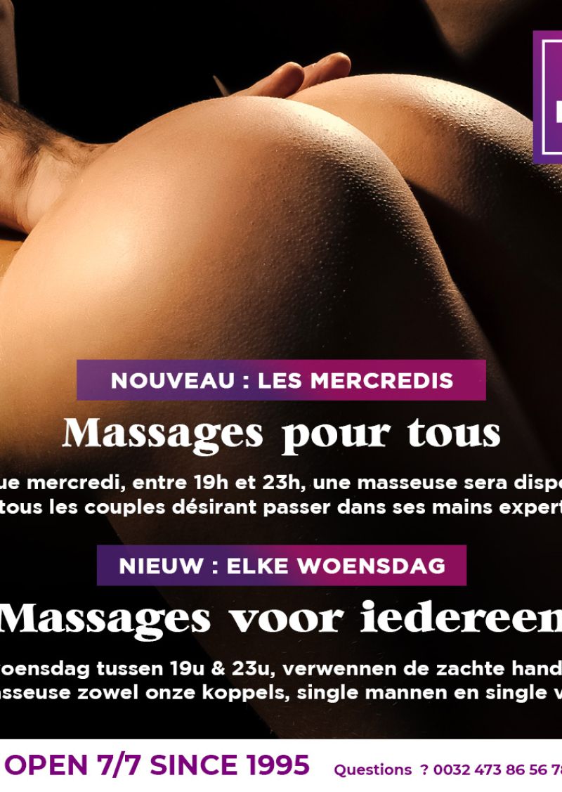 Les mercredis, entre 19h et 23h, une masseuse sera disponible pour tous les couples désirant passer dans ses mains expertes. Et toujours massages érotiques pour les Messieurs seuls!